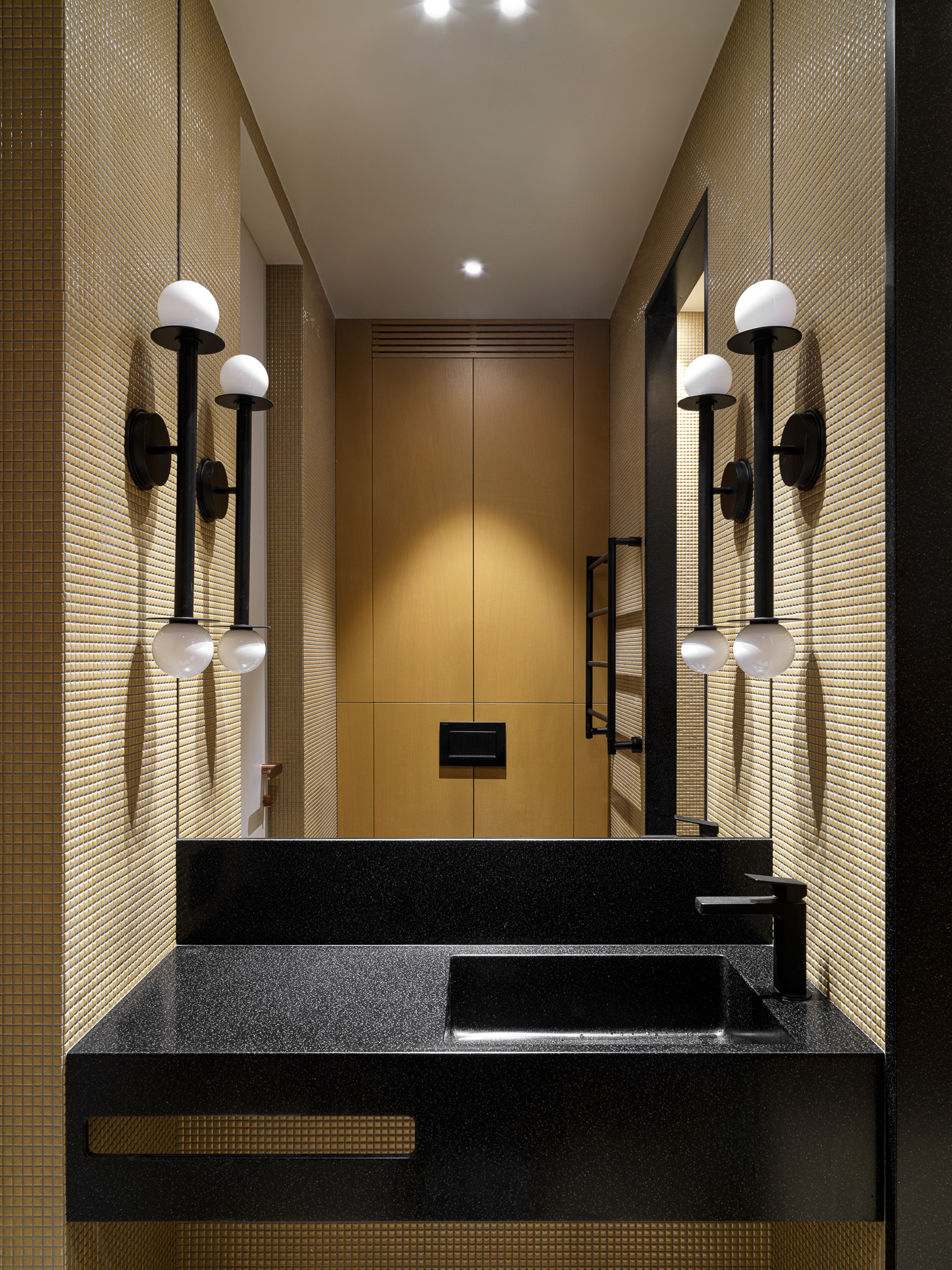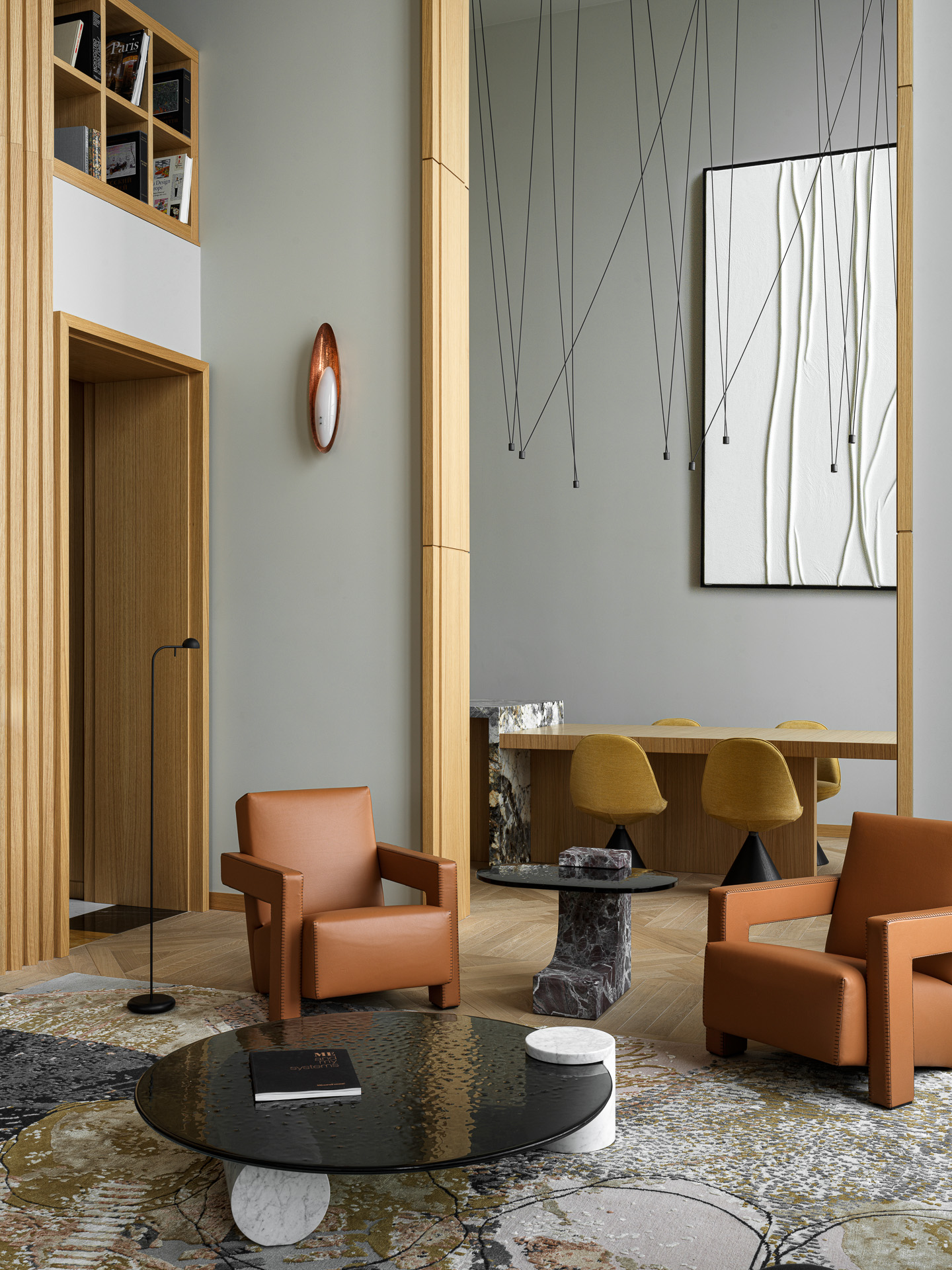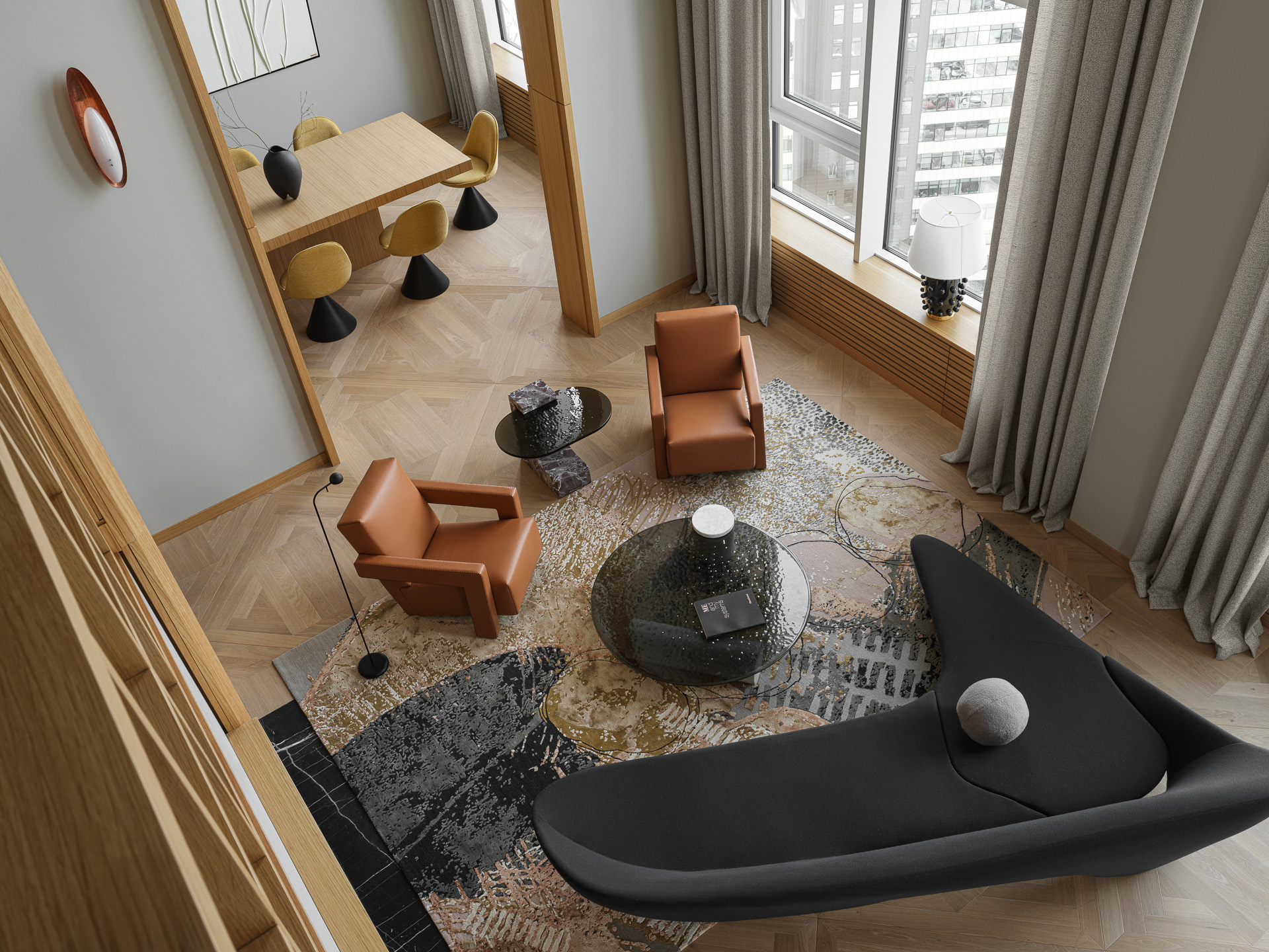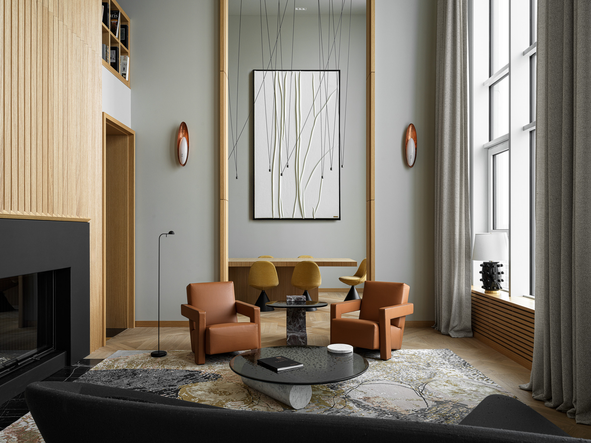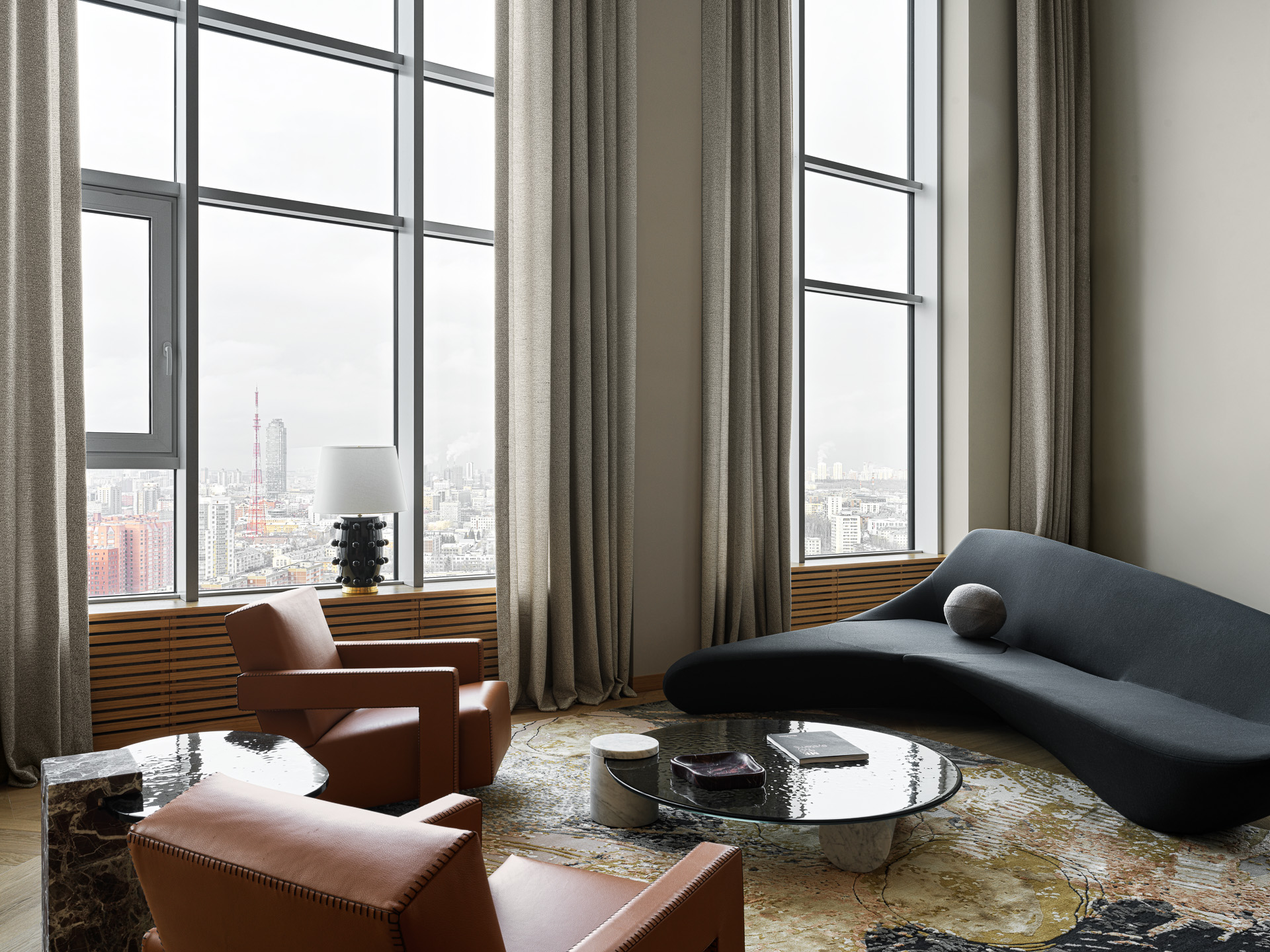 A two-story penthouse on the 32nd floor with a city view and a wood-burning fireplace. Total area is 190 m². The ceiling height in the living room and kitchen is 6 meters. The apartment includes a living room, kitchen, two walk-in closets, laundry room, sauna, bedroom, bathroom, guest bathroom, and library. Expensive natural materials were used in the design. Marble, wood, textile wallpaper, and mosaic.