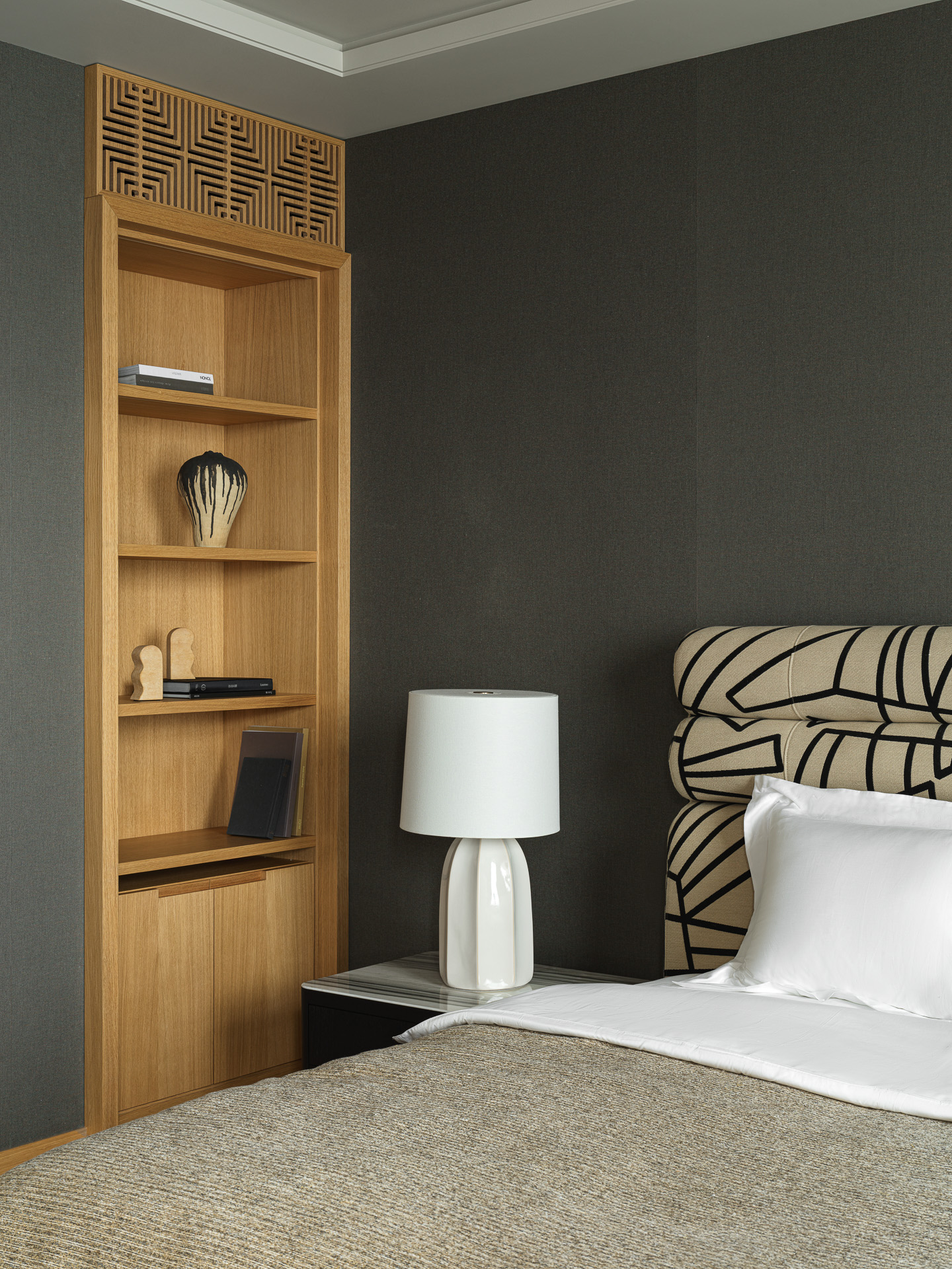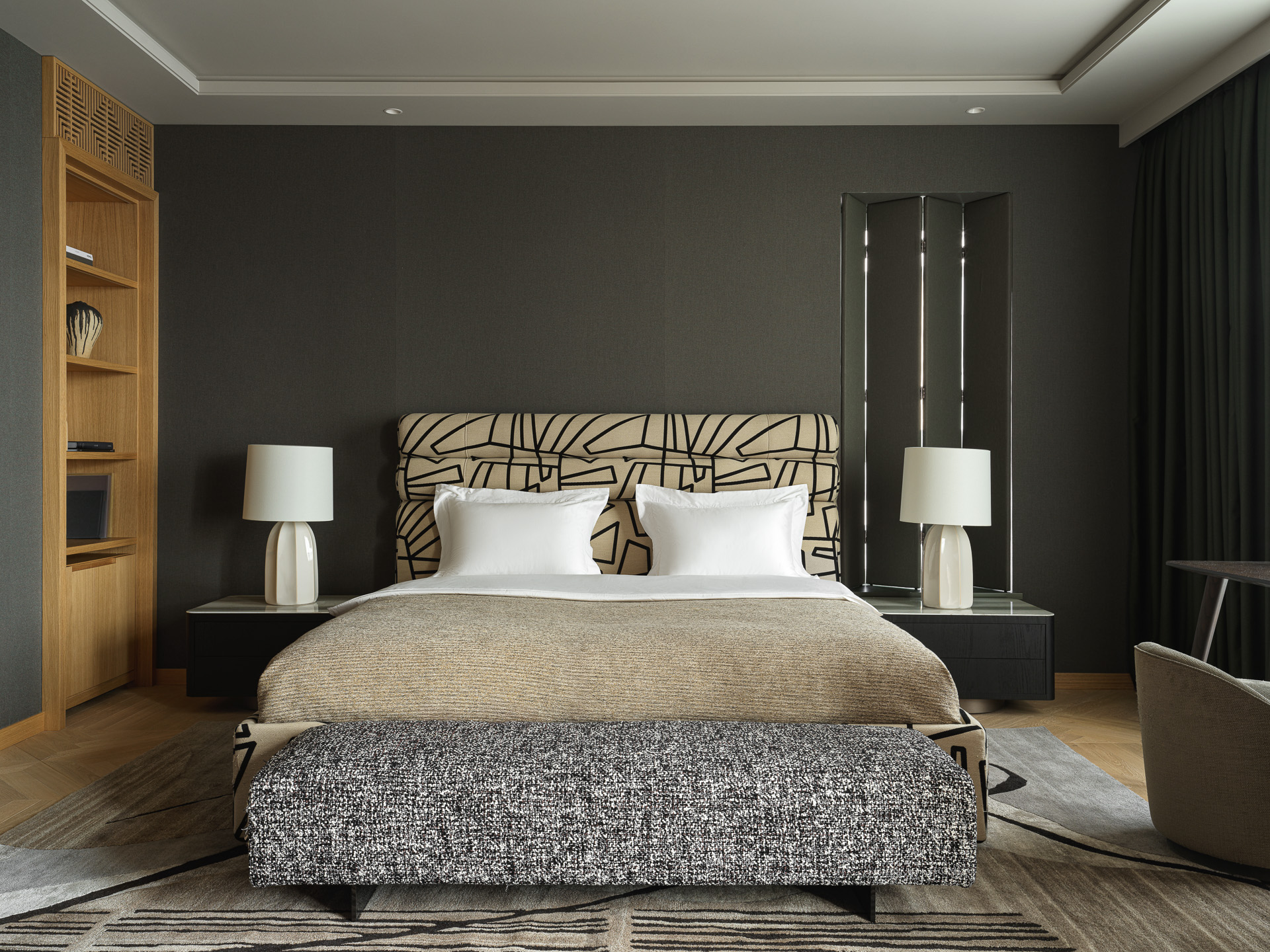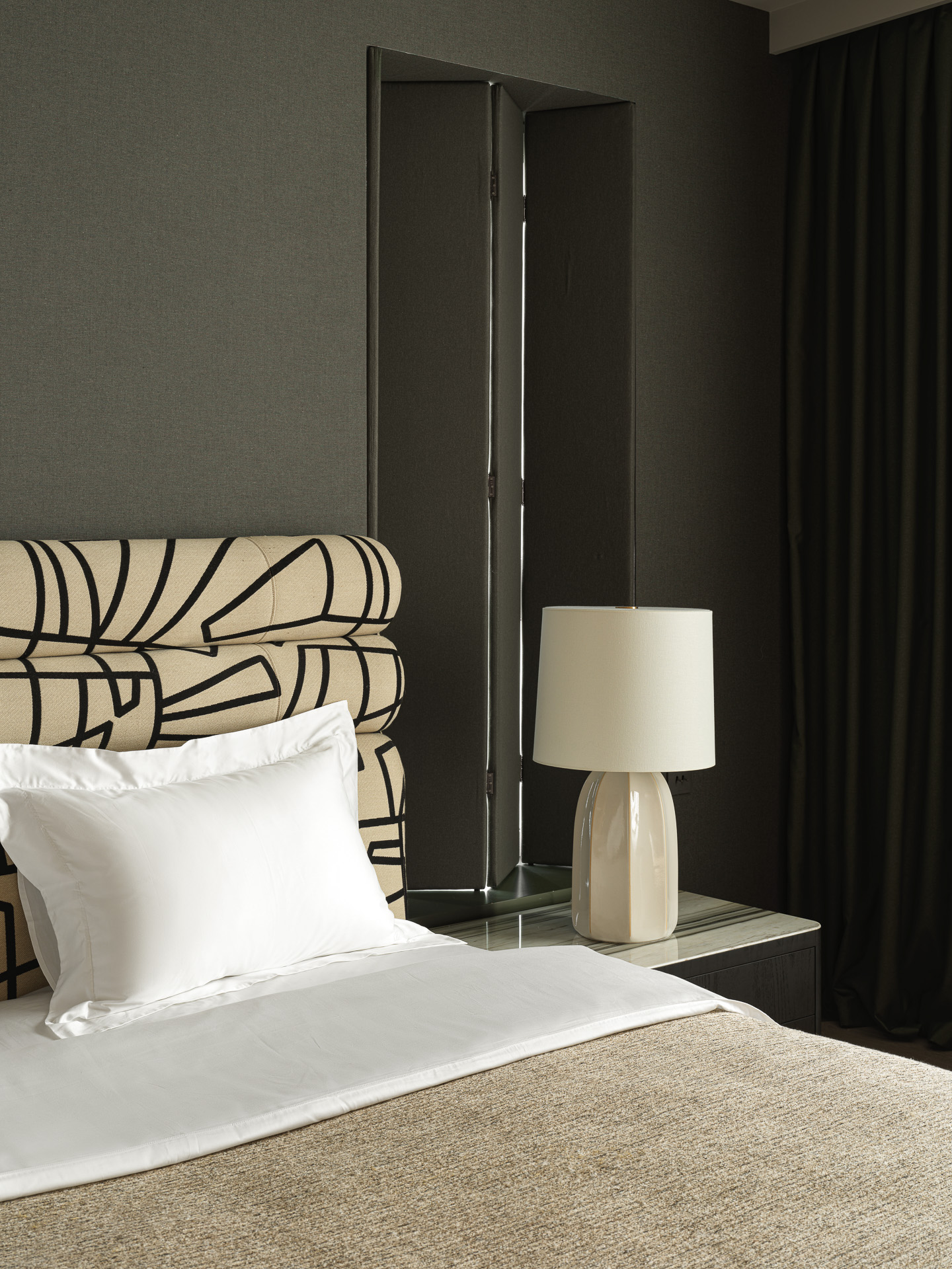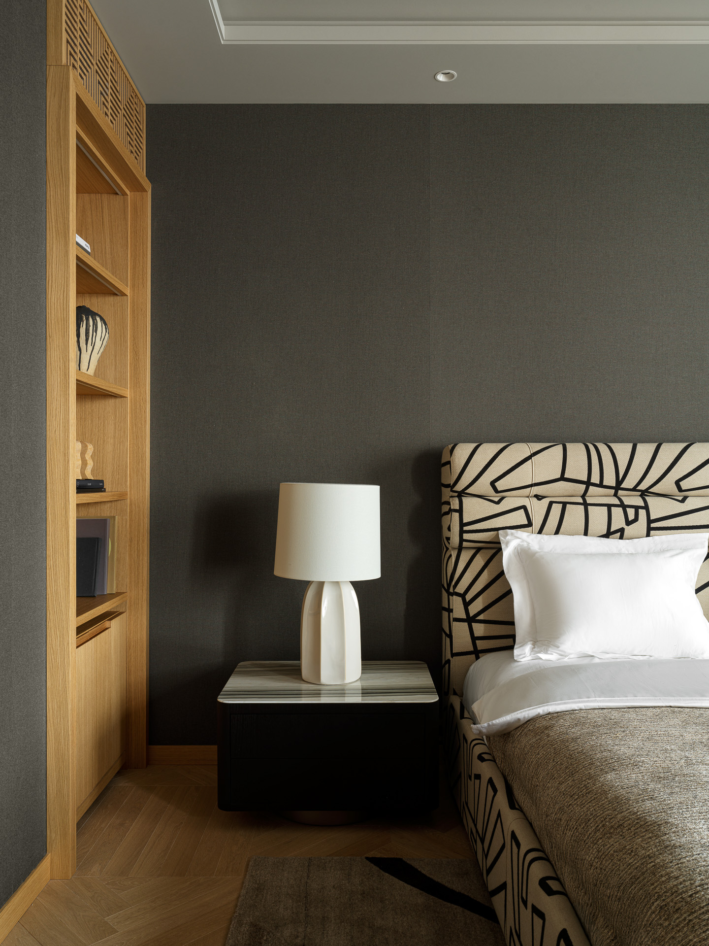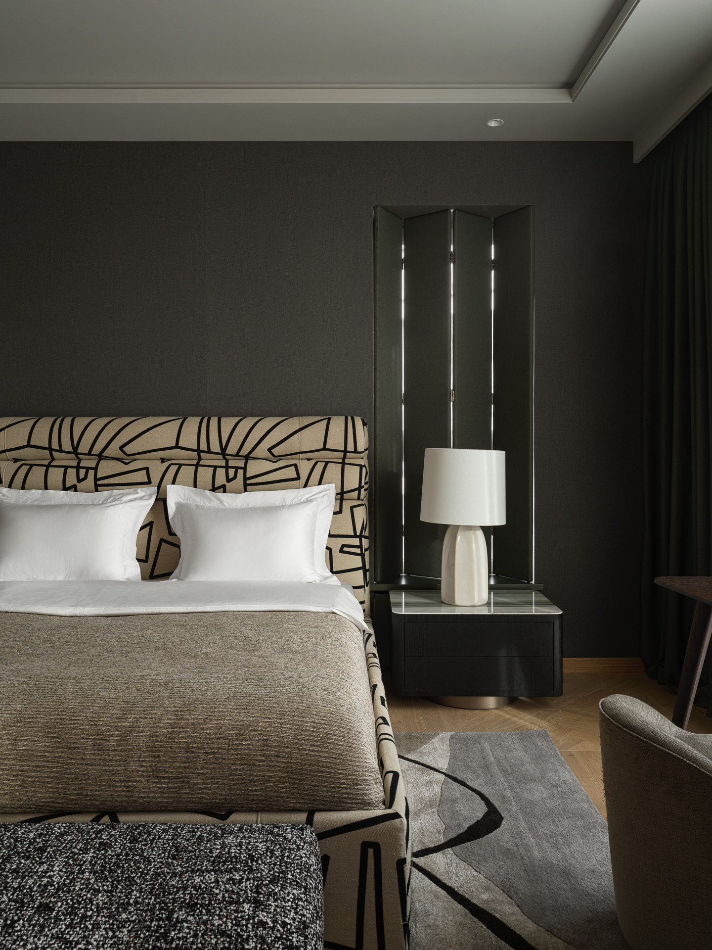 A two-story penthouse on the 32nd floor with a city view and a wood-burning fireplace. Total area is 190 m². The ceiling height in the living room and kitchen is 6 meters. The apartment includes a living room, kitchen, two walk-in closets, laundry room, sauna, bedroom, bathroom, guest bathroom, and library. Expensive natural materials were used in the design. Marble, wood, textile wallpaper, and mosaic.