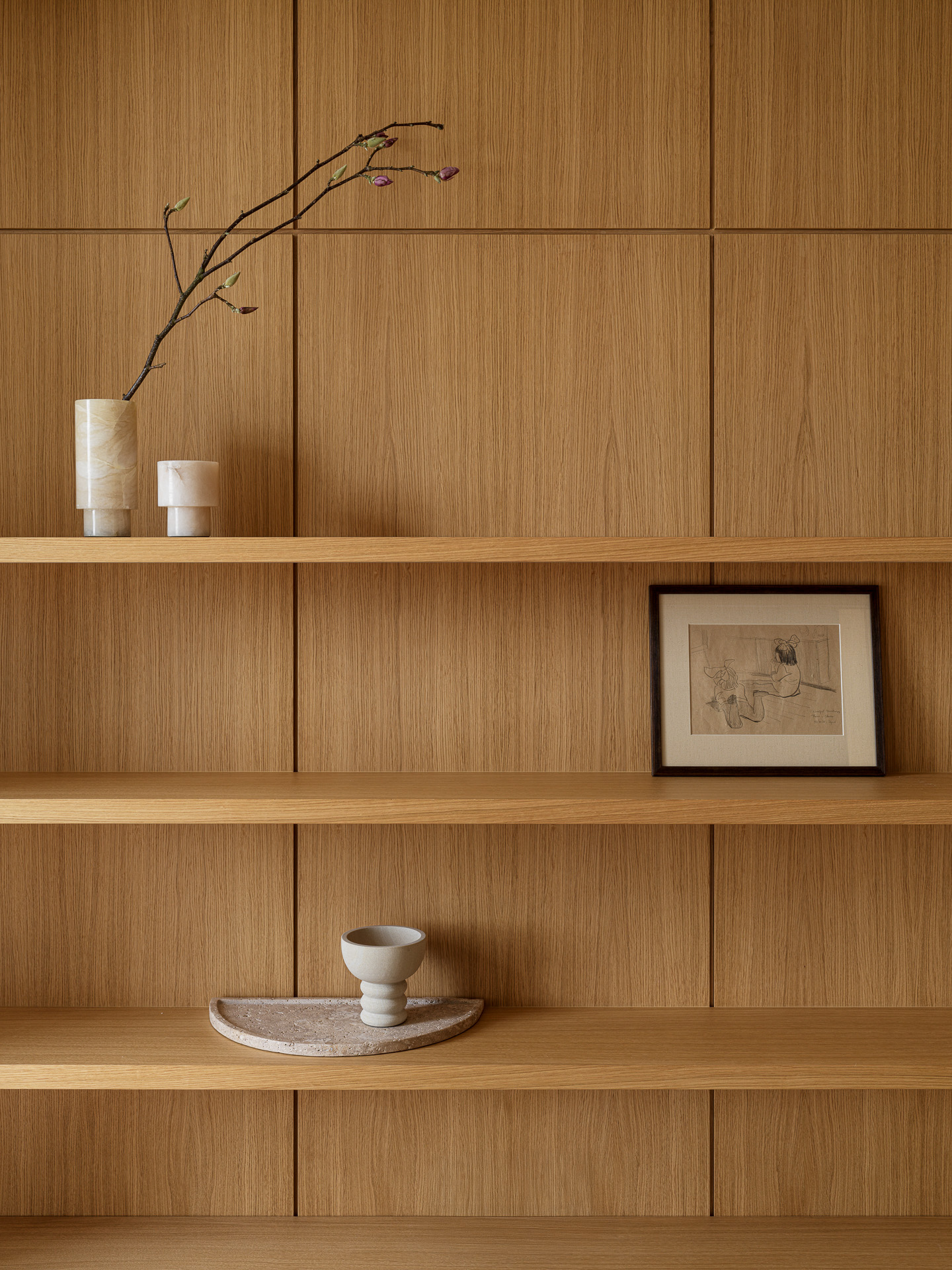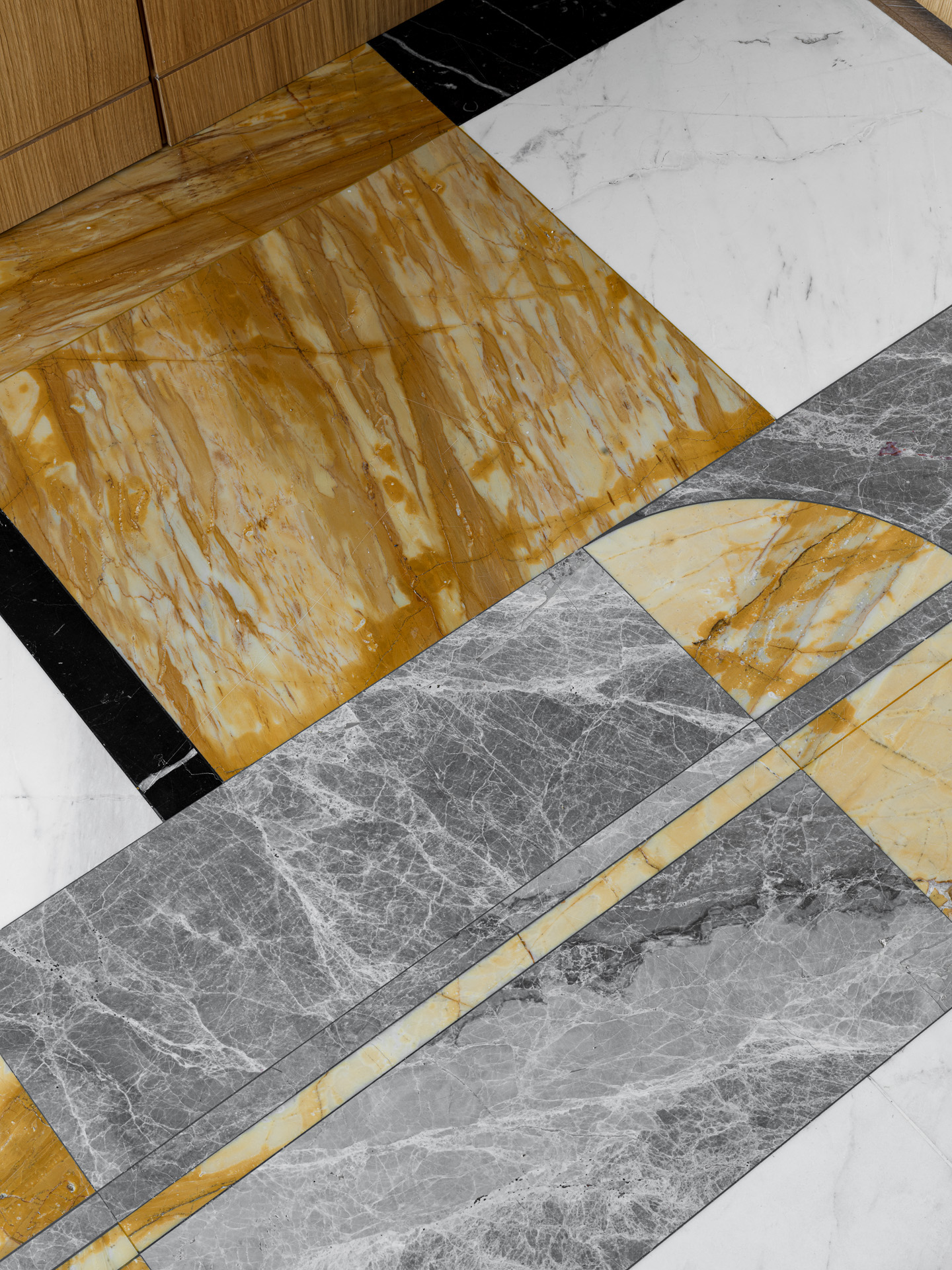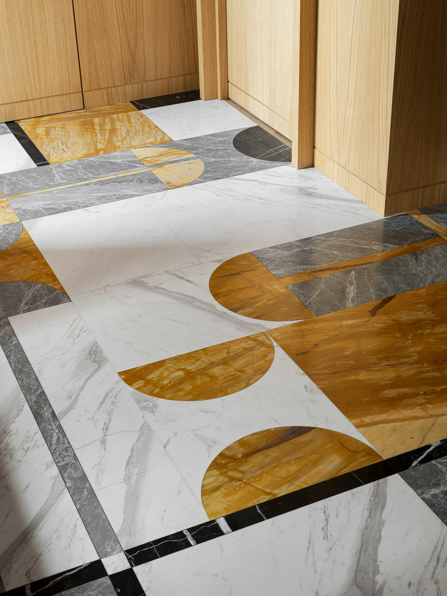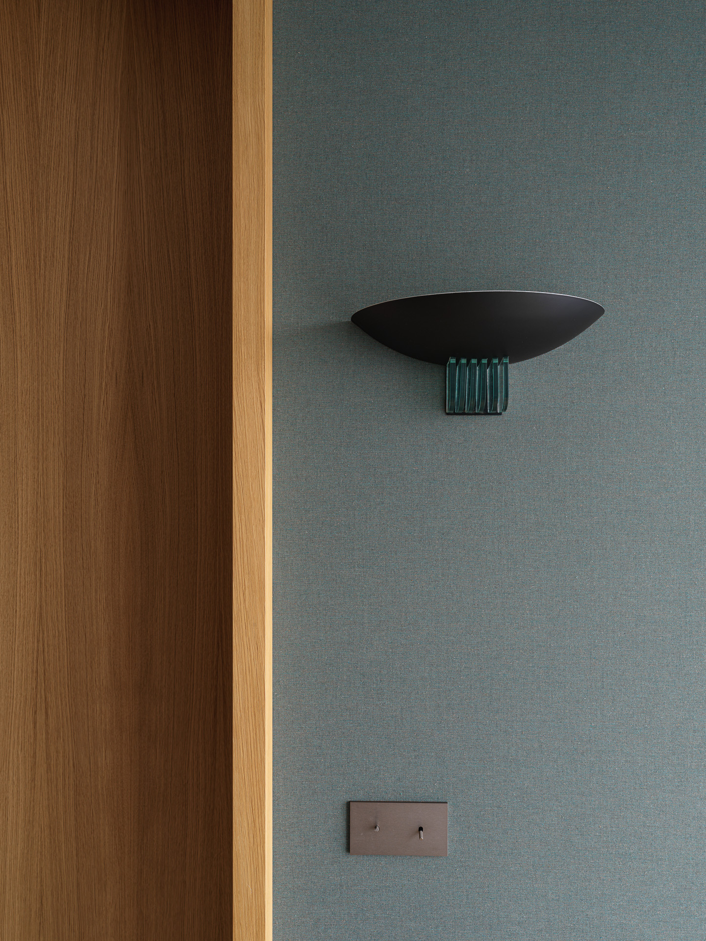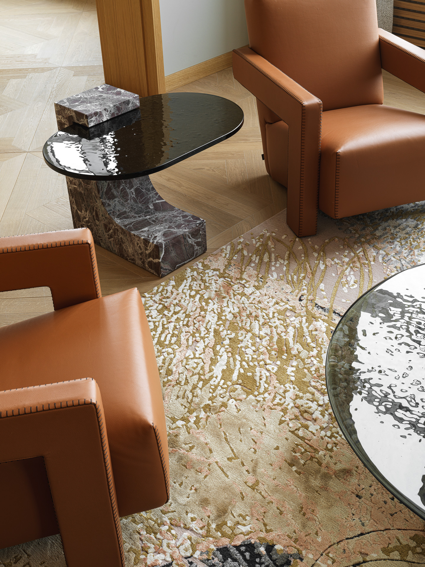 A two-story penthouse on the 32nd floor with a city view and a wood-burning fireplace. Total area is 190 m². The ceiling height in the living room and kitchen is 6 meters. The apartment includes a living room, kitchen, two walk-in closets, laundry room, sauna, bedroom, bathroom, guest bathroom, and library. Expensive natural materials were used in the design. Marble, wood, textile wallpaper, and mosaic.